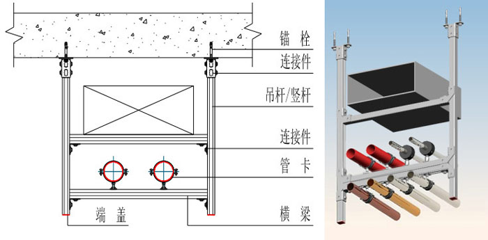 成品管道支吊架,是將給排水、空調(diào)通風(fēng)、消防、強(qiáng)電、弱電等安裝工程中的各專(zhuān)業(yè)的支吊架綜合在一起,通過(guò)標(biāo)準(zhǔn)化構(gòu)件組合形成統(tǒng)一的管道支吊架系統(tǒng)。