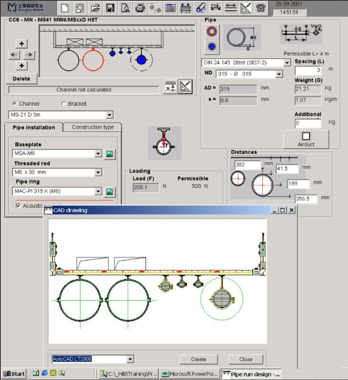 進(jìn)行所承管線荷載及支吊架的計(jì)算及策劃,主要是通過(guò)專(zhuān)用管道支吊架軟件設(shè)計(jì)及校核,出具受力計(jì)算書(shū)和CAD圖紙。