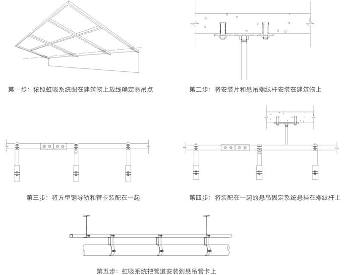 第一步:依照虹吸系統圖在建筑物上放線確定懸吊點第五步:虹吸系統把管道安裝到懸吊管卡上
