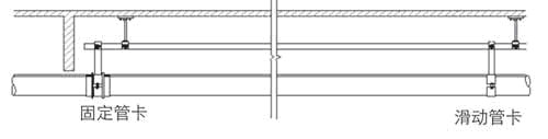 有別于傳統的固定點配合伸縮節的固定方法,該固定系統利用固定管卡和滑動管卡將管道固定在與之平行的方型鋼導軌上,不設伸縮節。
